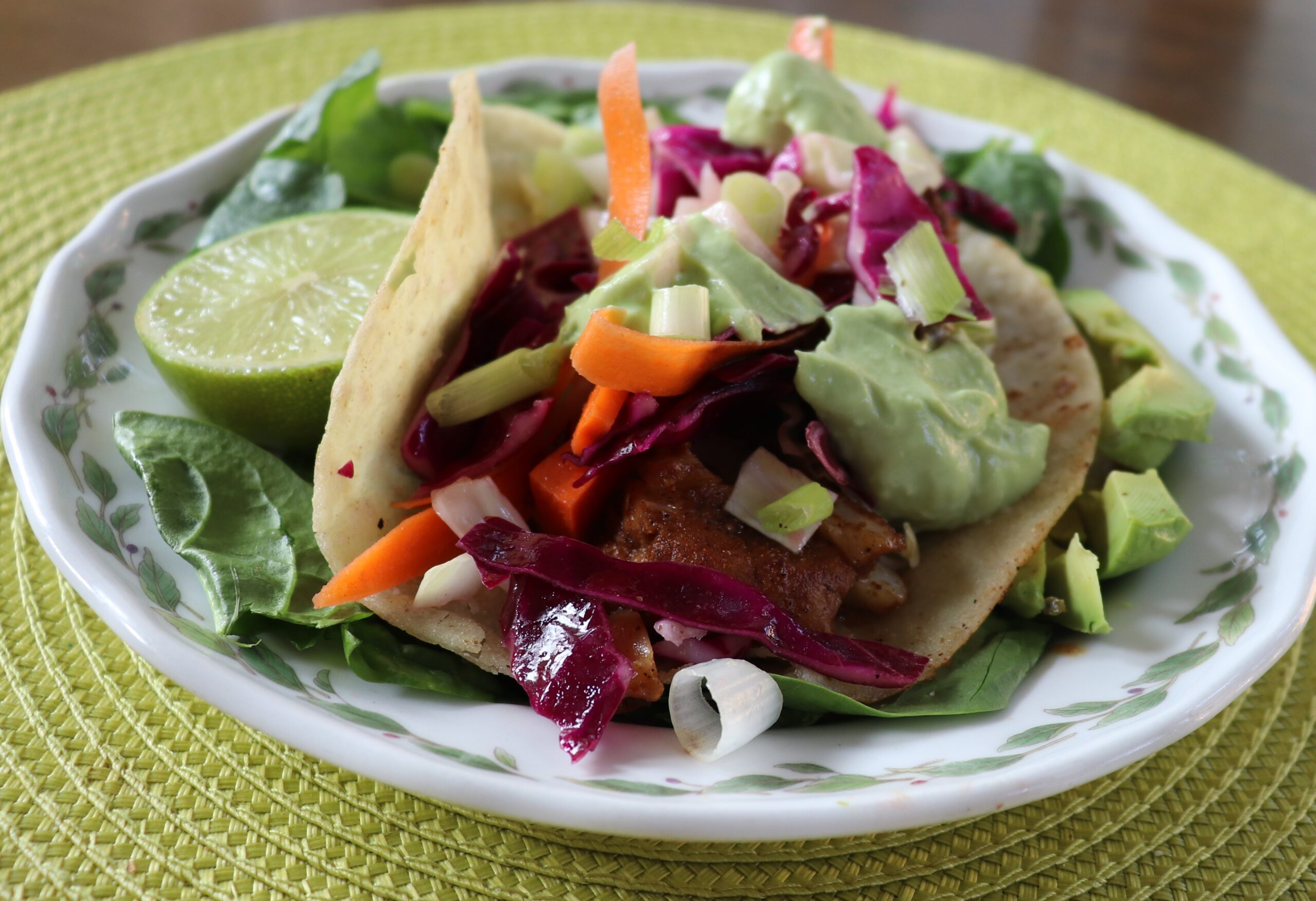 Fish Tacos with Cabbage Slaw & Avocado Crema